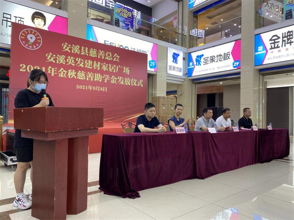 金秋送爽,爱心相约。2021年9月8日上午,安溪县慈善总会联合英发建材家居广场举办金秋助学金发放仪式,发放13.5万元资助45名贫困学子圆梦大学。县慈善总会秘书长林志平同志、英发工艺吴美玲同志和陈境翔同志、英发建材家居广场黄坤明同志和李景飞同志参加发放仪式。