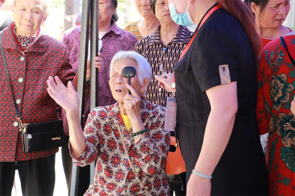 活动现场,医务人员开展眼健康科普宣传教育活动,为群众发放眼健康科普宣传材料,并详细讲解眼健康知识。以林力平为首的专家团队在现场进行白内障眼疾筛查义诊,为居民测视力、测眼压、进行裂隙灯检查和免散瞳眼底照相,工作人员现场登记并指导被初步判断为白内障眼疾的群众填写《福建省“八闽点睛行动”救助申请表》,并为患有眼疾的居民发放老花镜、眼药水。