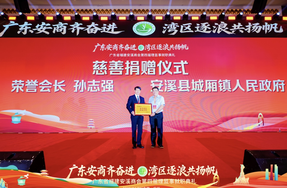 广东省福建安溪商会长期热心于社会公益活动,一直以来反哺家乡的乡村振兴工作,本次就职仪式上,商会会员企业又奉献爱心,捐赠善款820万元用于家乡的文化、道路、教育及乡村振兴等慈善公益项目。