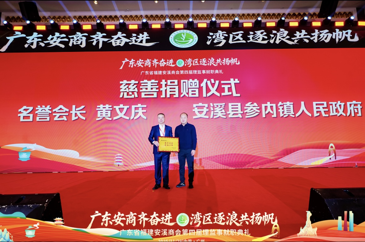 2025年11月29日,广东省福建安溪商会举行第四届理监事就职典礼,在就职仪式上,广东省福建安溪商会会长黄建平代表商会向安溪县慈善总会捐赠人民币200万元用于慈善公益项目,安溪县慈善总会秘书长林志平代表总会接受捐赠。